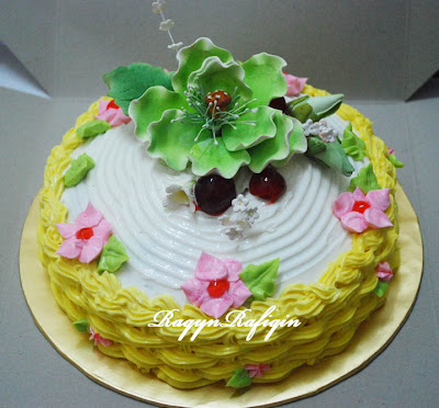 Bekenan betoi aku tgk kaler cuppies ni.. nampak comei.. Cuppies ni En. Am yang order untuk buah hati tersayang.. Cik Damia.. En. Am minta kalau boleh cup tu nak yg kecil2 saja.. Jadi aku guna solo cup ni yg bersaiz 'xs' je.. bila susun penuh2 dalam kotak nampak comel2 pulak.. kek ni plak kek choc moist kegemaran buah hati dia ler..En. Am kata dia suka kaler kuning, Damia lak suka pink.. dan suka makan 'aising'.. Hmm kena boh buttercream lebih la kalau camtu kan.. hehehe.. Lepas bincang2, kami persetujui utk design yg paling simple di donia.. kihkihkihkih....